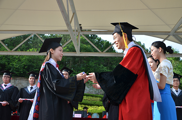 学校学位评定委员会副主任委员黄钢副院长宣读了“授予2014届普通本科毕业生学士学位”的决议。经评定,我校授予5470名毕业生学士学位。学校党委梁英书记为志愿服务西部和山区的毕业生代表佩戴绶带并颁发纪念品。