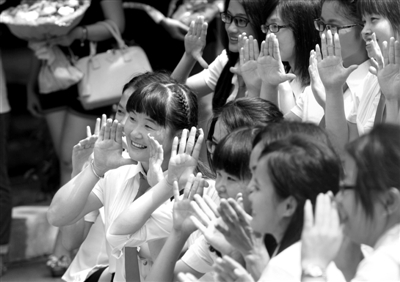 笑迎挑战 ② 在湛江师范学院,毕业生在相机前露出笑脸与母校合影留念。