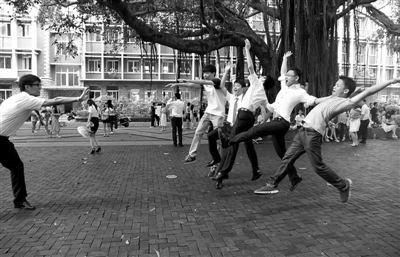 跃步向前 ③ 拍过毕业照后,即将离校的学生和朋友们在配合拍摄有创意的“滞空”影像。 记者 孙昊声 摄影报道