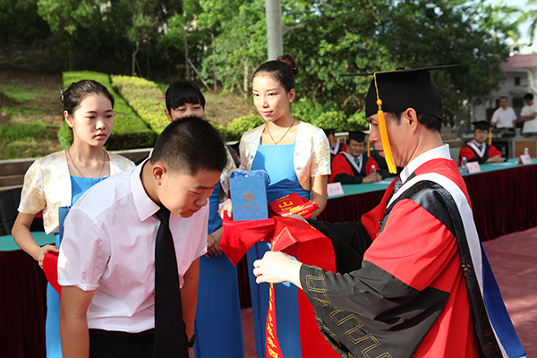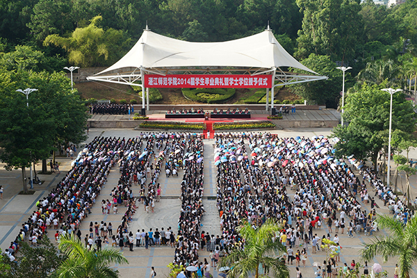 湛师新闻中心讯: 凤凰花开时,六月骊歌鸣。6月19日上午,我校2014届学生毕业典礼暨学士学位授予仪式在雷阳广场隆重举行。仪式由学校刘海涛副书记主持。学位评定委员会主任委员罗海鸥院长为获得学士学位的毕业生代表颁授学位证书。学校学位评定委员会全体成员及基础教育学院院长身穿导师服,与各二级单位主要负责人、全体辅导员、毕业班班主任、家长代表等共同见证这一令人难忘的时刻。