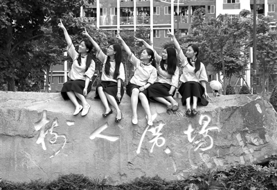 憧憬未来 ① 昨日上午,在湛江师范学院宿舍楼前的石头上,五名穿着怀旧服装的毕业生模仿电影《那些年我们一起追过的女孩》中的场景拍照。